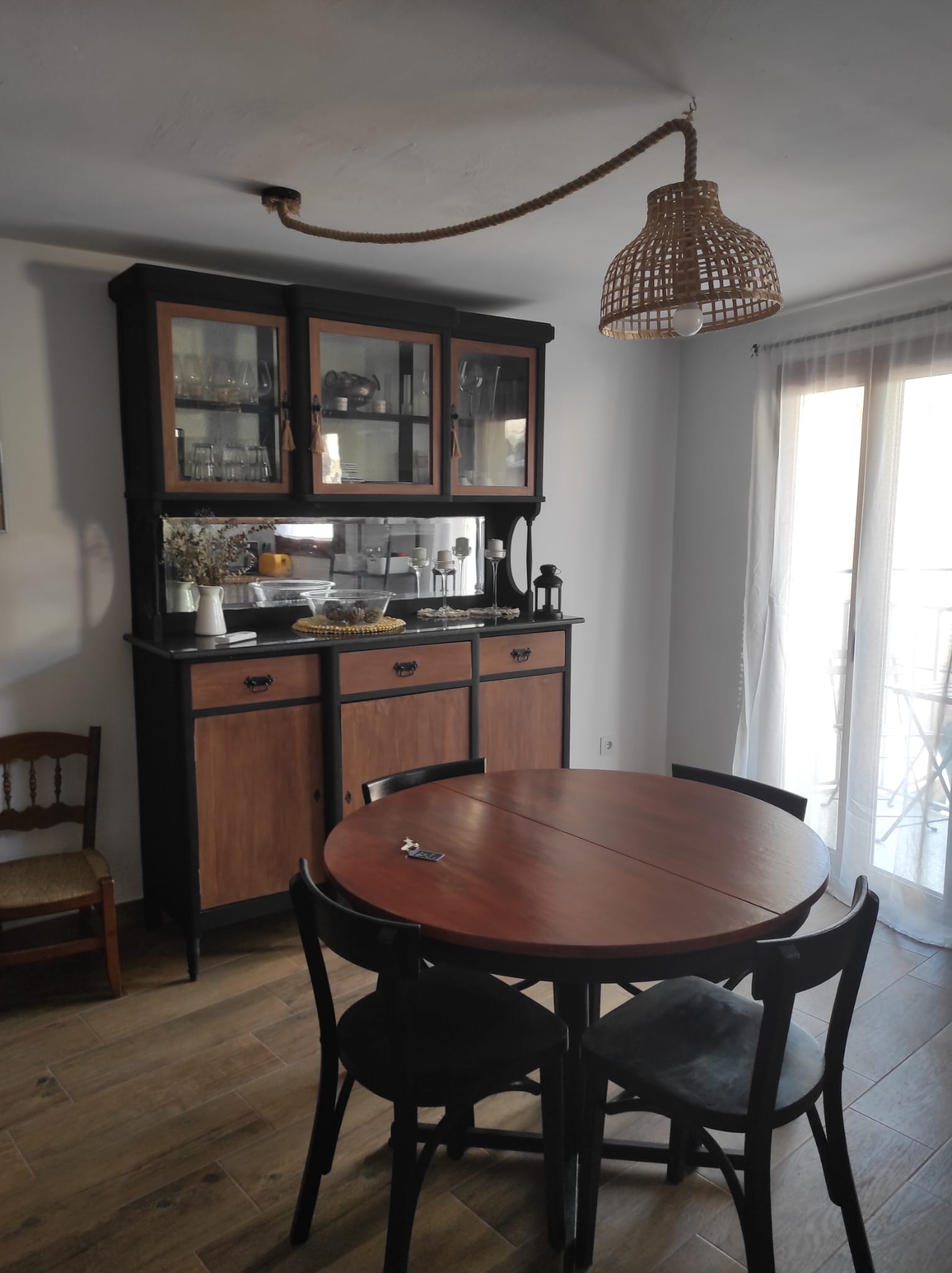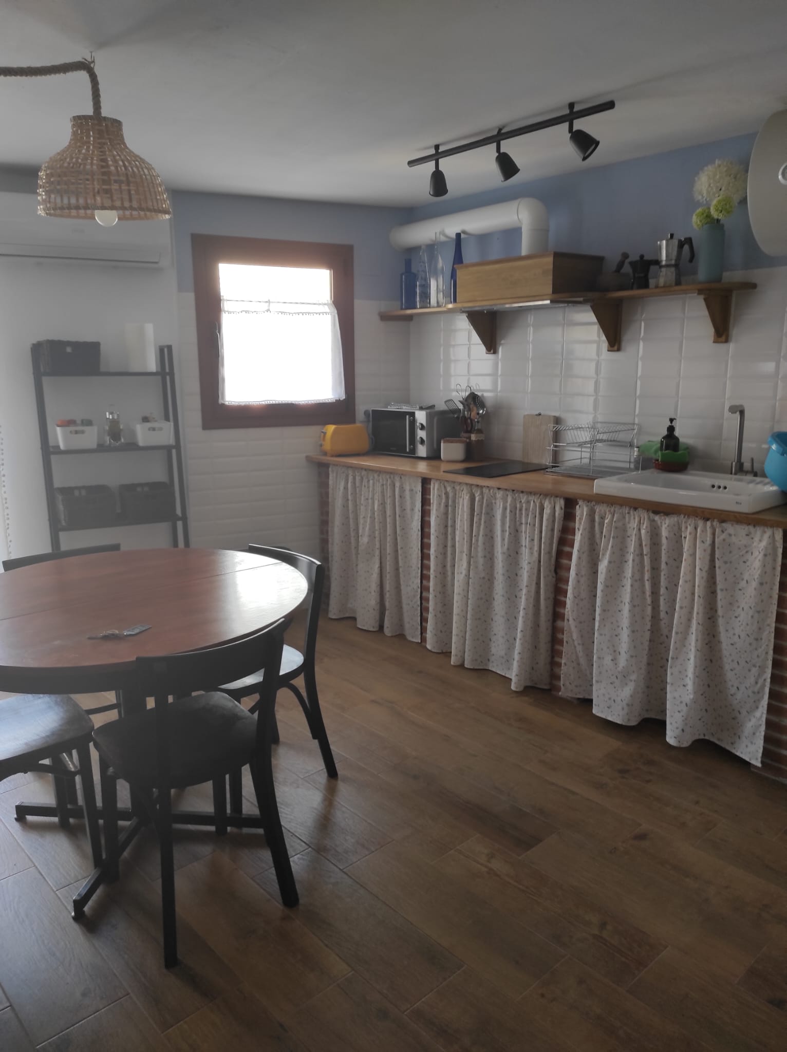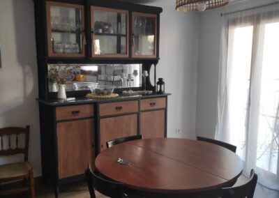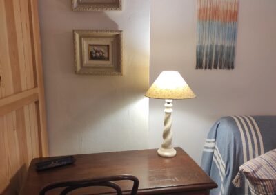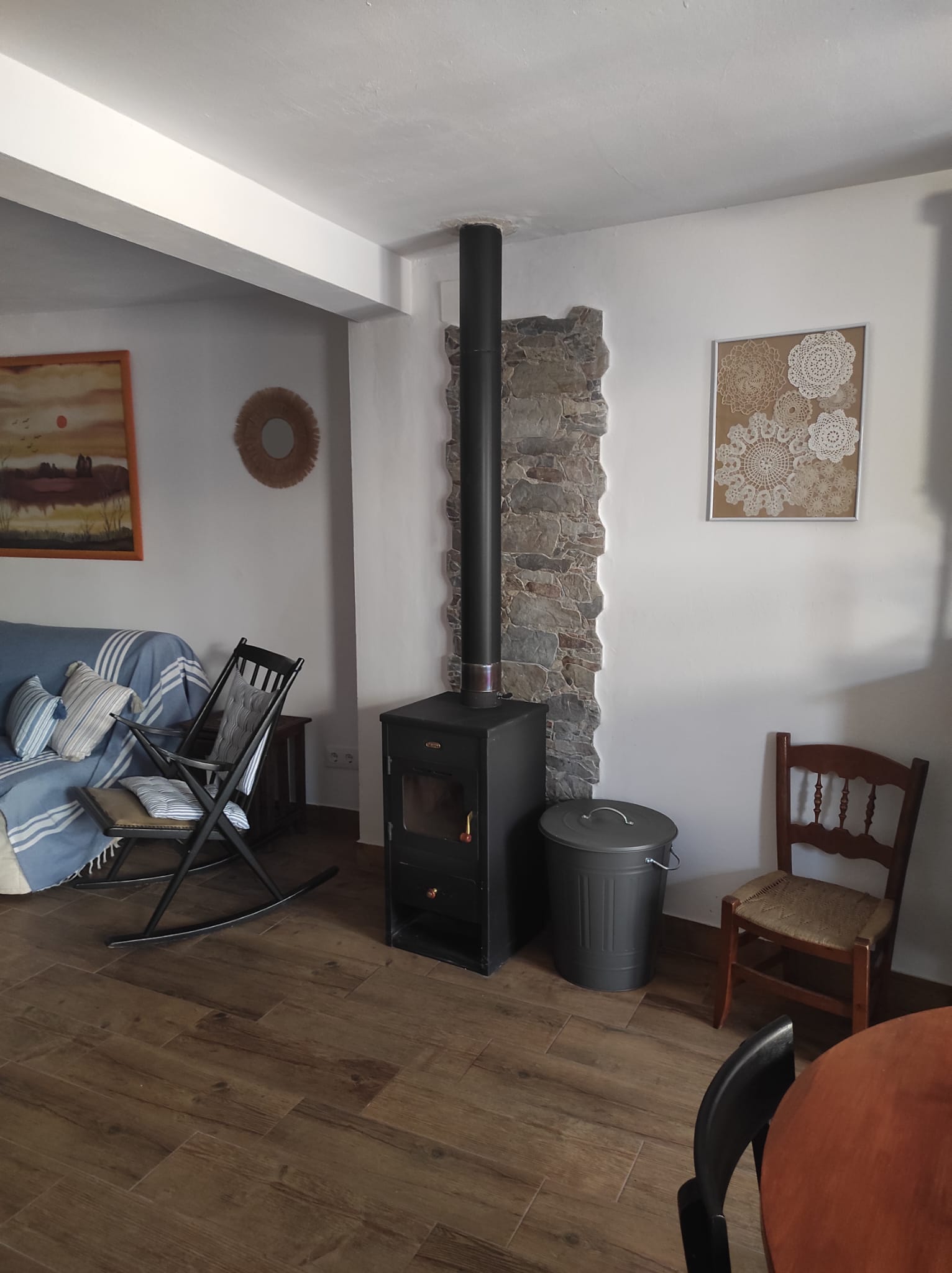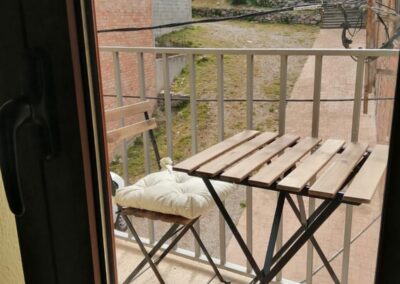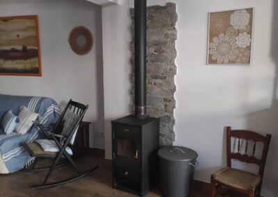 La cocina está equipada con todo lo necesario, incluyendo una nevera y un microondas con función grill, para que puedas preparar tus comidas favoritas. El salón, amplio y luminoso, cuenta con un sofá cómodo y una televisión, perfecto para relajarte después de un día explorando la región. Además, el apartamento está equipado con calefacción (bomba de calor y frío) y una estufa de leña para los meses más fríos.