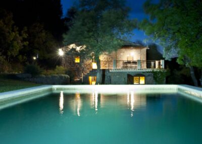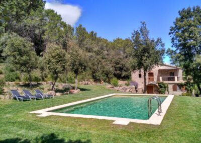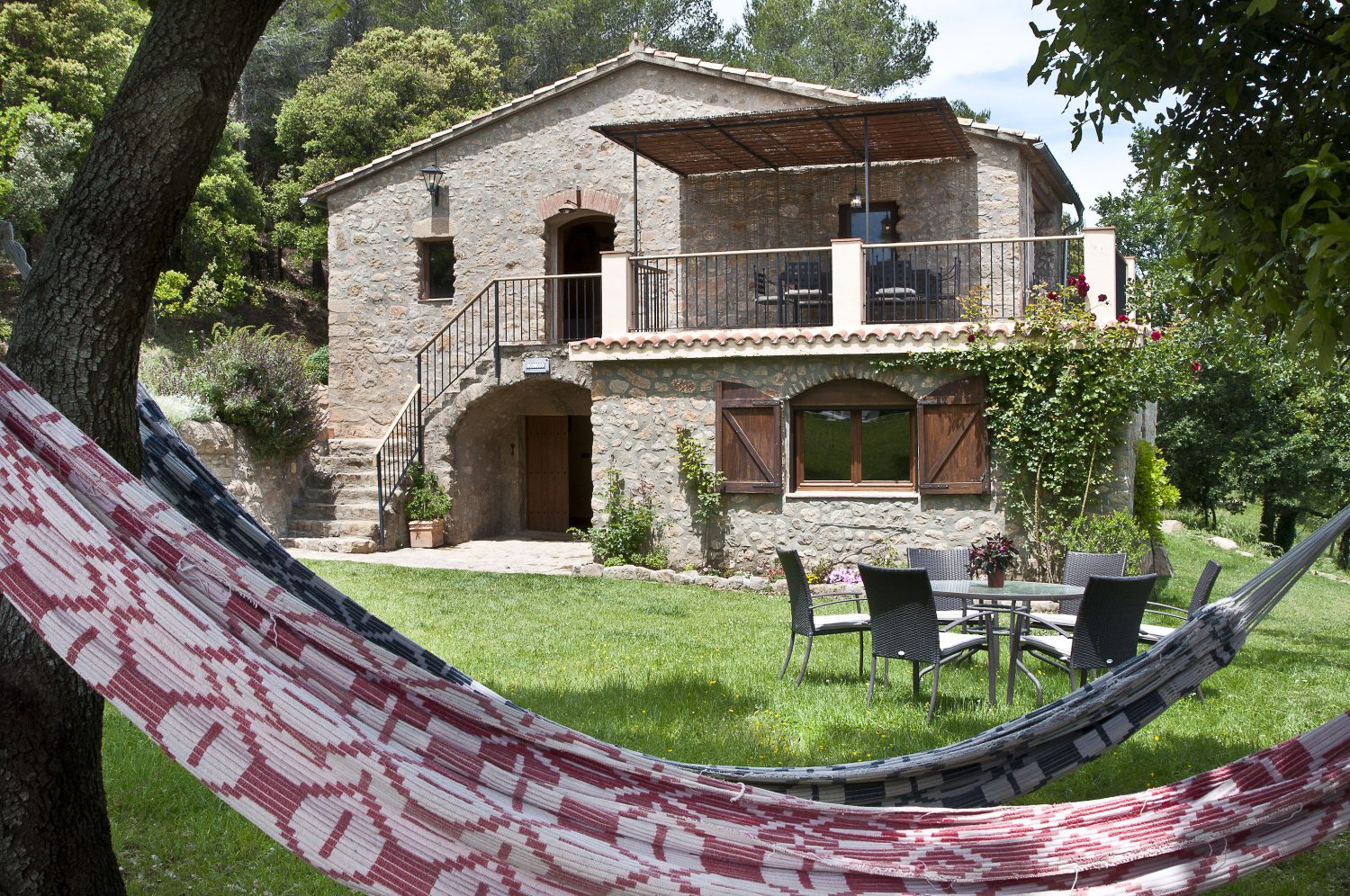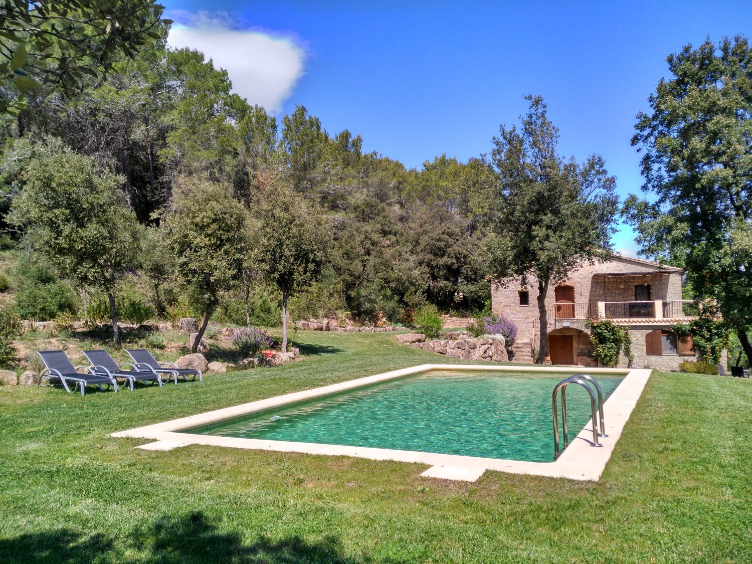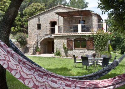 La finca de la masía abarca 11 hectáreas de bosque con varios senderos para explorar. En este oasis natural se encuentra la piscina, donde los huéspedes pueden relajarse tomando el sol en las tumbonas o disfrutar de una siesta reparadora en las hamacas, bajo la sombra de los cerezos.