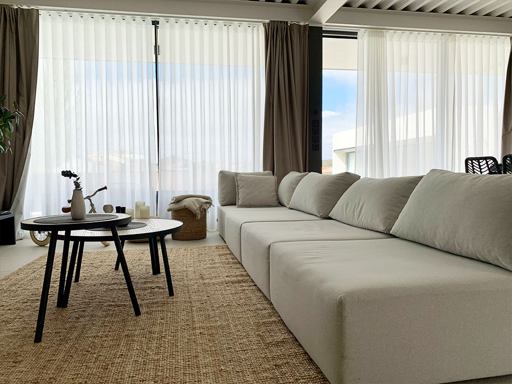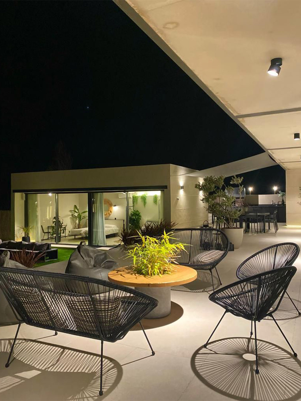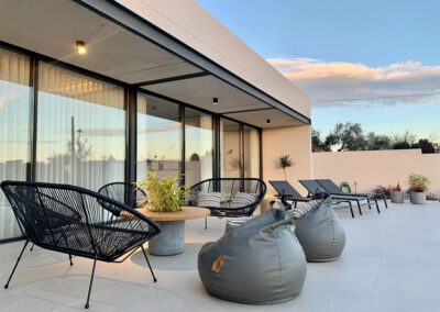 Tumbonas, zona de sofás y pufs.