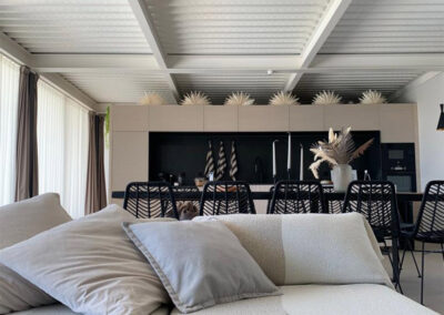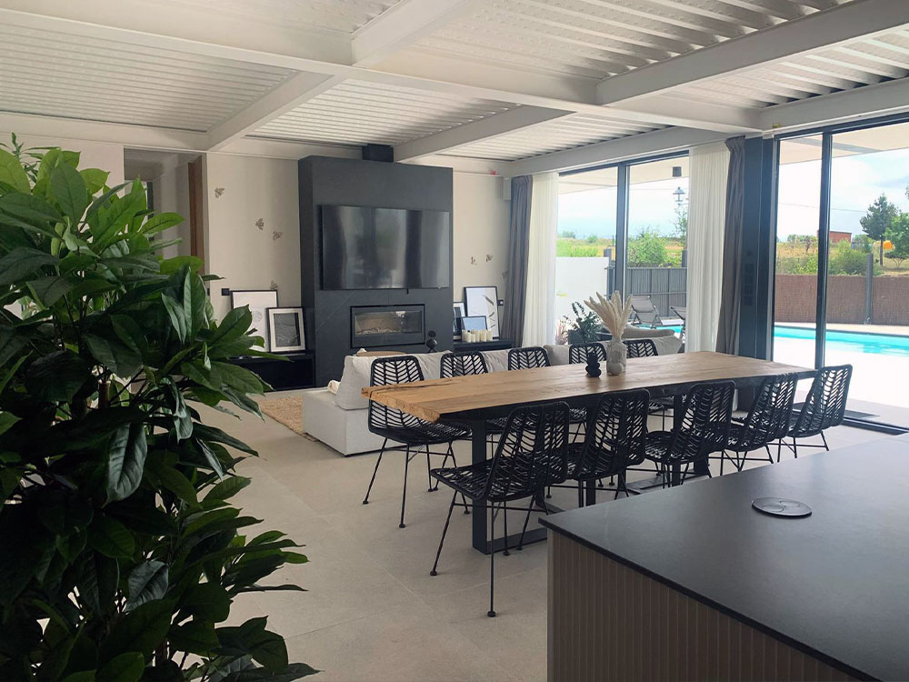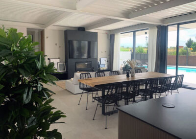 Salón. Insert de leña y TV 75”. Sofás, mesa amplia de comedor.