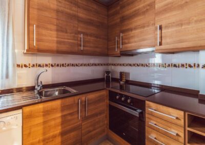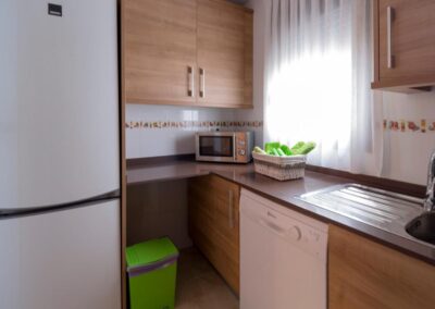 La cocina está completamente equipada con todo lo necesario para una estadía cómoda, incluyendo nevera, lavavajillas, lavadora y microondas, además de tostadora, exprimidor y triturador.