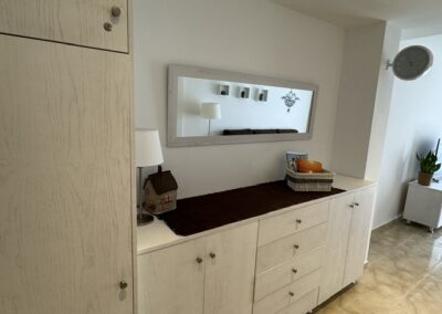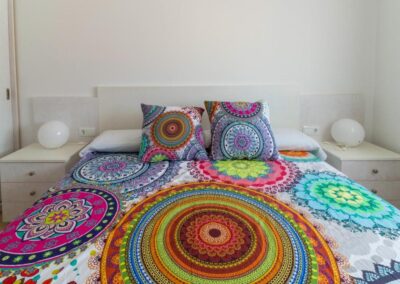 Una de las habitaciones ofrece una cama doble Queen-Size de 180 cm de ancho, flanqueada por dos mesitas de noche y un armario alto con cajones.