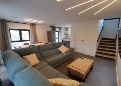 Gran Villa independiente con todas las comodidades para poderse alojar hasta 18 personas. La casa dispone de un amplio patio totalmente vallado de 2.000m2 con zona de barbacoa con pérgola, mesas y sillas y también dispone de un parque infantil para los más peques. La planta baja del interior de la casa, está preparada para poder alojarse personas en silla de ruedas (no hay ningún escalón, las puertas y el plato de ducha tienen el ancho suficiente para poderse mover sin impedimentos ). Además el salón principal donde se puede reunir todo el grupo a comer se encuentra en esta misma planta. La casa tiene una decoración moderna y tiene grandes ventanales.